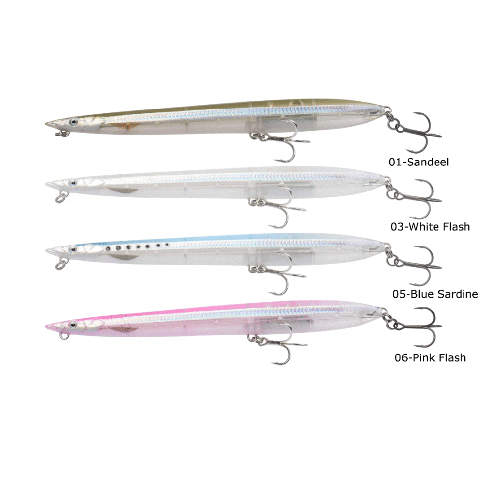 Sandeel Surf Walker, gerçek bir kum balığının üç boyutlu taranması ile üretilmiştir. Uzun ince Güçlü Sert ABS gövde, çekip bırakıldığında inanılmaz yan aksiyona ve düz çekildiğinde şaşırtıcı ince S kavis aksiyonuna sahiptir. Yüzen versiyonda yatay denge vardır. Döndürme durdurulunca kafayı hafiften yukarıda tutarak en mükemmel yaralı balık profilini oluşturur. Uzun atış tasarımı sessizdir, en temkinli avcı balıklar için muhteşem bir su üstü sahte balıktır. Batan versiyonu, surf ve daha zorlu koşullar için uzun mesafeli atış amaçlı üretilmiştir ve arka haznede gürültülü bir tıngırtı çıkarır. Çekerken dümdüz yüzeye çıkar ve mükemmel parlama, sıçratma ve sesli tıngırtı sesi ile kolayca hareket eder.